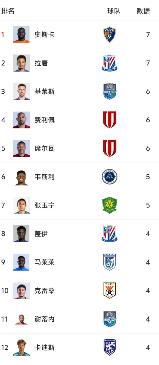 虎扑04月27日讯 中超联赛第8轮结束,本轮后,玉昆外援奥斯卡以7球追上申花外援拉唐,并列射手榜榜首。